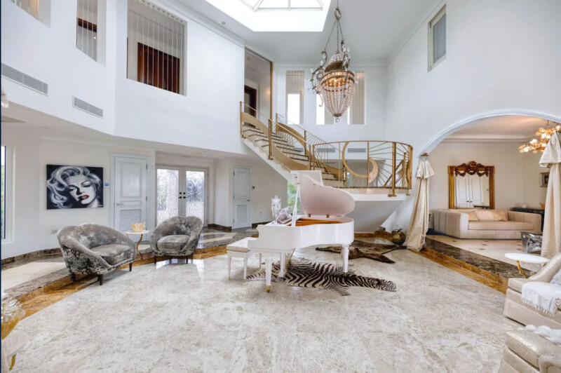 The double height grand Atrium is accentuated by an opulent rod iron and marble staircase. Bright floor to ceiling glass surrounds the totality of the living, dining and den- opening up to an expansive backyard.