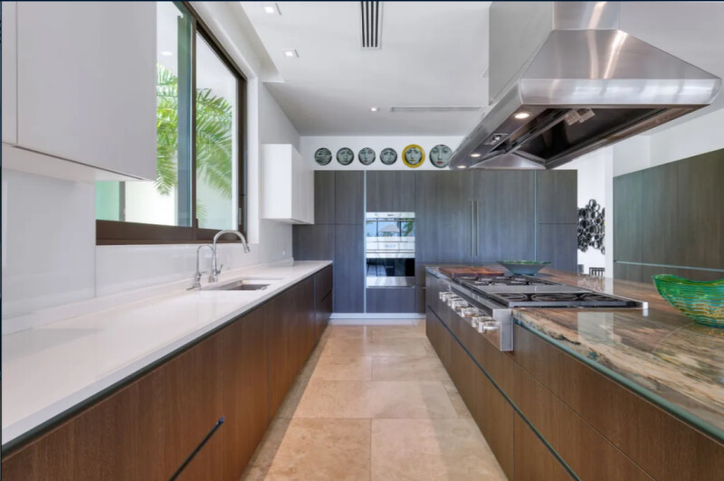 Between the use of rose gold, matrix marble and granite, and walls of glass bringing the outdoors inside, the open plan boasts an adventurous spirit and creative charm that naturally takes over. Bold and contemporary, this trophy compound isn't shy of color or expression.