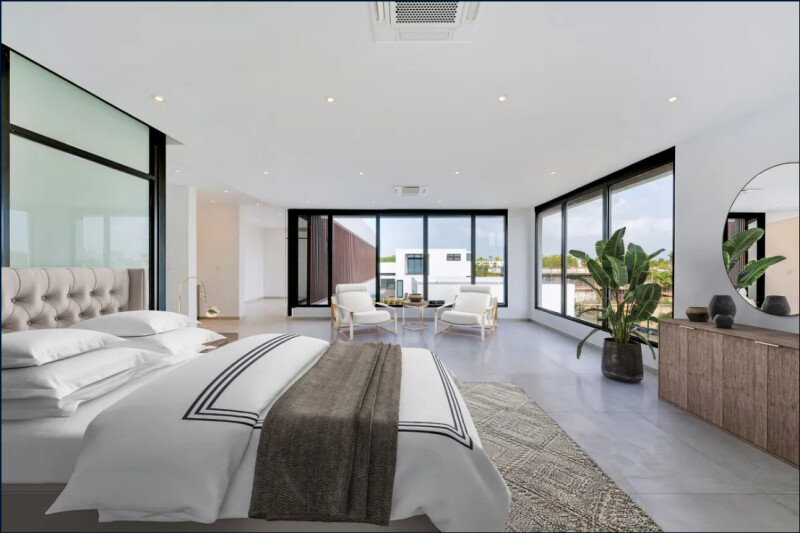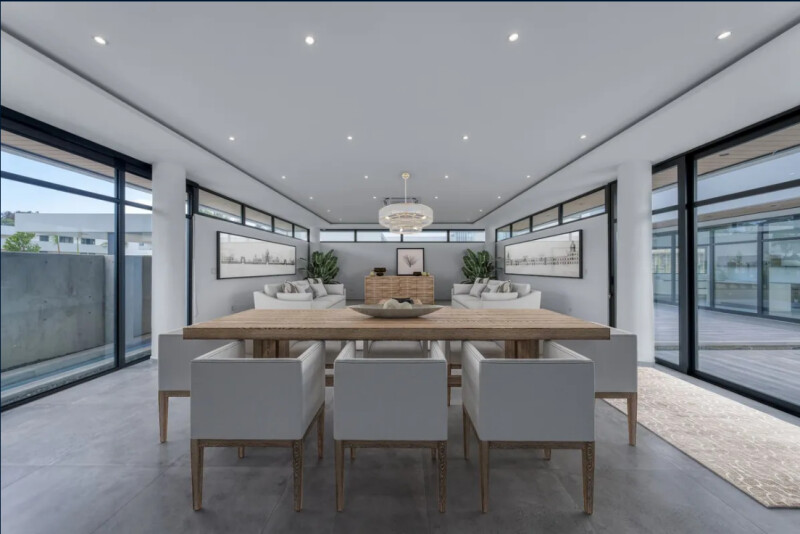 Offering five bedrooms, five full baths and a powder room, the main residence with approx. 8,315 interior Sq. Ft. features smart home capabilities, LED lighting luminaires and exquisite finishes throughout the impressive open-concept floorplan. The first level showcases a 63'6' x 25'1' living room with adjacent dining area, powder room and designer kitchen with prep room/pantry, Italian cabinetry and top appliances. The bedrooms, all of which enjoy ensuite baths and walk-in closets, are tastefully distributed throughout the second level for the utmost privacy. The primary suites spacious layout overlooks the outdoor area and includes a wet bar, as well as an oversized walk-in closet that connects to the primary bath with dual vanities.
