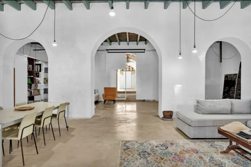 The first floor features a wine cellar and courtyard with lush greenery, laundry room, bathroom and storage closet, as well as a 1-bedroom apartment with full bathroom and kitchen with separate entrance bedrooms; in addition to a separate space with approx. 1,345 Sq. Ft. and its own private entrance on the corner of Luna and San Justo St., which is currently being used as an investment loft-style property including queen size bed, Kitchen and bathroom and huge open layout) that can easily be converted into a store front, restaurant, office space and/or gallery. The second floor showcases a sizable family room and gym with basketball hoop, as well as an additional kitchen with custom-made shelving and 4 bedrooms, 2 of which are within portable 'pods' with 2 bathrooms that have a unique bi-level apartment layout. The third floor houses the primary suite and den which seamlessly connect to the outdoor space.