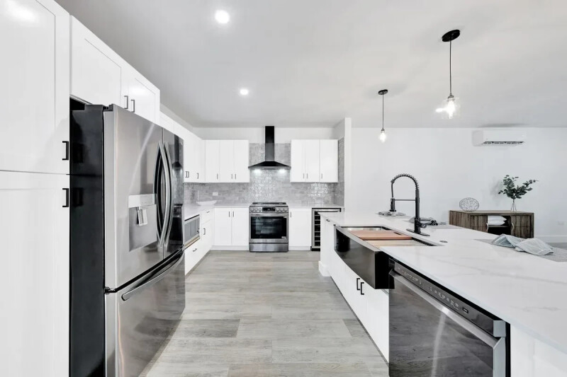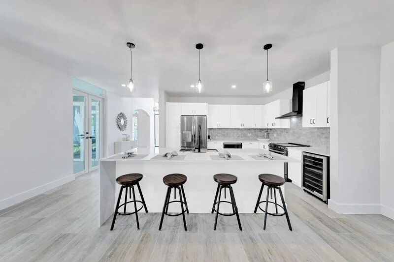 Boasting high-end appliances, including top-tier culinary tools, meal preparation becomes a delightful experience. The breakfast bar provides a sociable space for casual dining, while the wine fridge adds an element of luxury to entertaining.
